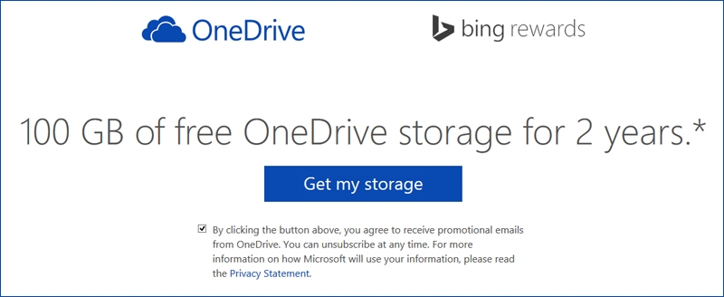 Для того чтобы принять участие в акции, помимо аккаунта Microsoft, необходимо являться подписчиком Bing Rewards — программы вознаграждений, стимулирующей использование поисковой системы Bing (в России, увы, программа недоступна). Если эти условия соблюдены, достаточно активировать опцию «100 GB of free OneDrive storage» (100 бесплатных гигабайт в OneDrive) и дождаться подтверждения от Microsoft.