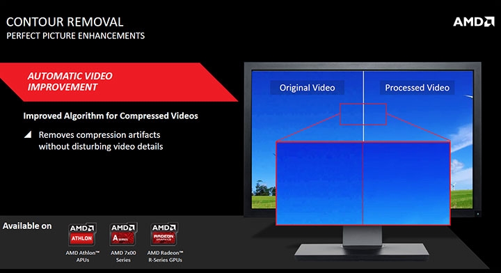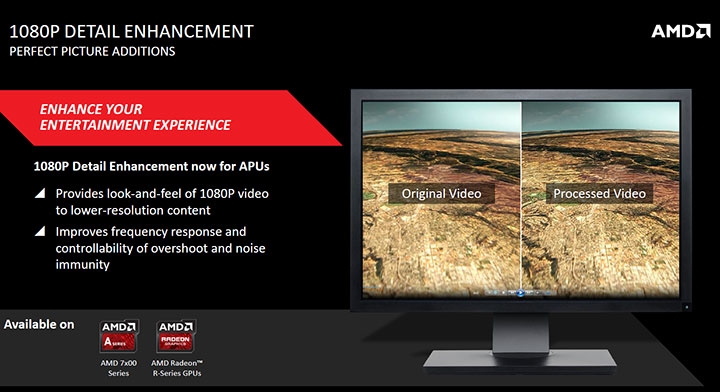 Третье новшество — улучшение деталей видеоматериалов в низком разрешении при воспроизведении на мониторе с разрешением 1080p. Эта функция уже присутствует в драйверах AMD, но теперь она появилась не только на GPU, но и на последних APU серии 7000 A.