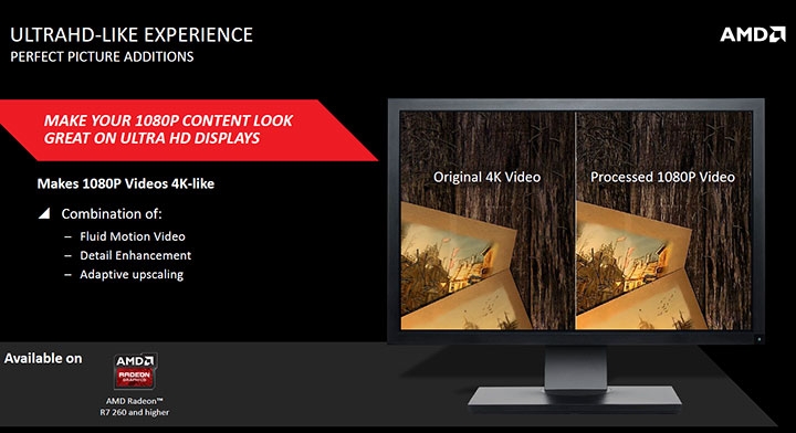 Ещё одна функция аналогична предыдущей, но призвана максимально качественно масштабировать видео в разрешении 1080p на экранах с разрешением Ultra HD (4K). Для её работы нужен дисплей 4K, GPU Radeon R7 260 и выше или APU 7000 A.