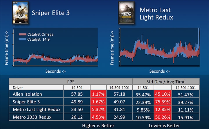 В новом драйвере также были существенно улучшены показатели ритмичности вывода кадров. Ранее технология применялась только для конфигураций Crossfire, теперь же она доступна и в режиме Dual Graphics (совместная работа APU и GPU). AMD также отмечает небольшой прирост производительности (он, впрочем, не принципиален).