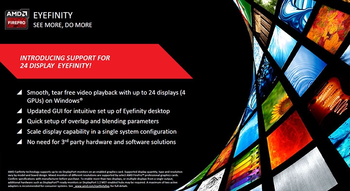 Также появился новый режим Eyefinity, позволяющий объединять в громадный дисплей до 24 мониторов без дополнительного ПО (требуется 4 видеокарты).