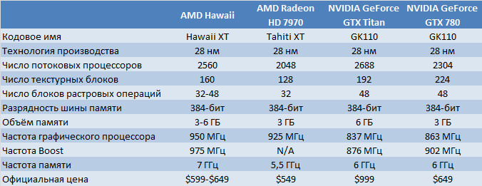 характеристик AMD Hawaii в сравнении с предшественниками и конкурентами
