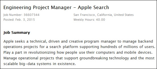 Компании из Купертино требуется главный инженер для работы по проекту Apple Search. Специалисту предстоит трудиться в Сан-Франциско (Калифорния, США). В числе требований к кандидатам значатся не менее трёх лет опыта в соответствующей сфере и опыт работы с крупномасштабными инфраструктурными проектами. В описании вакансии также говорится, что деятельность будет связана с «поисковой платформой, поддерживающей сотни миллионов пользователей».