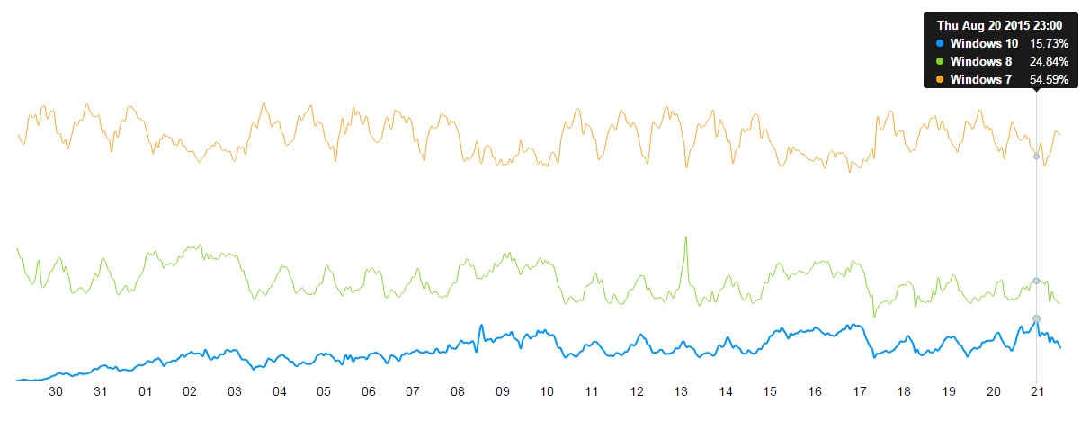 По аналогичному принципу устроена и статистика GoSquared, но только данные отображаются здесь не по итогам суток, а в режиме реального времени, при этом история сохраняется в виде графика со почасовой шкалой времени. Согласно этому графику, 20 августа доля «десятки» среди других операционных систем семейства Windows достигла пикового за период с 29 июля значения 15,7 %.