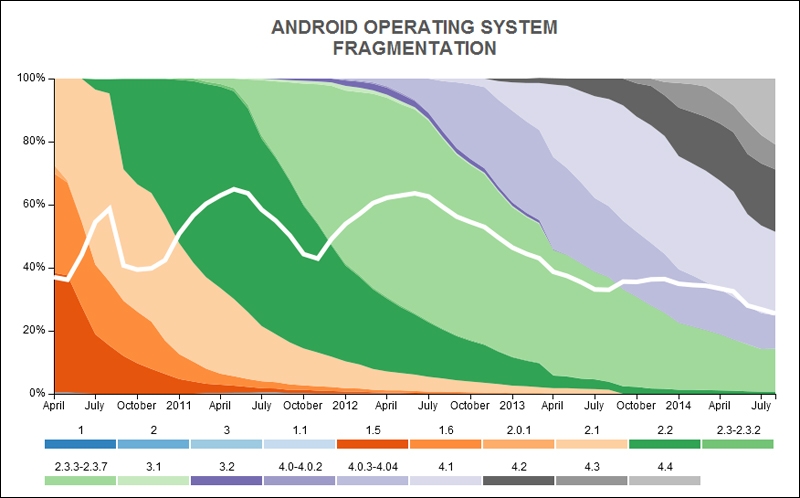 Ещё одна особенность экосистемы Android — большое количество версий платформы, существующих на рынке. Самой распространённой редакцией ОС является Jelly Bean. Суммарная доля различных версий этой системы, по оценкам, составляет 54,2 %. На KitKat 4.4 приходится 20,9 % рынка, а операционные системы линейки Gingerbread занимают 13,6 % Android-отрасли. Приблизительно 10,6 % приходится на платформы Ice Cream Sandwich; доля Froyo составляет около 0,7 %.