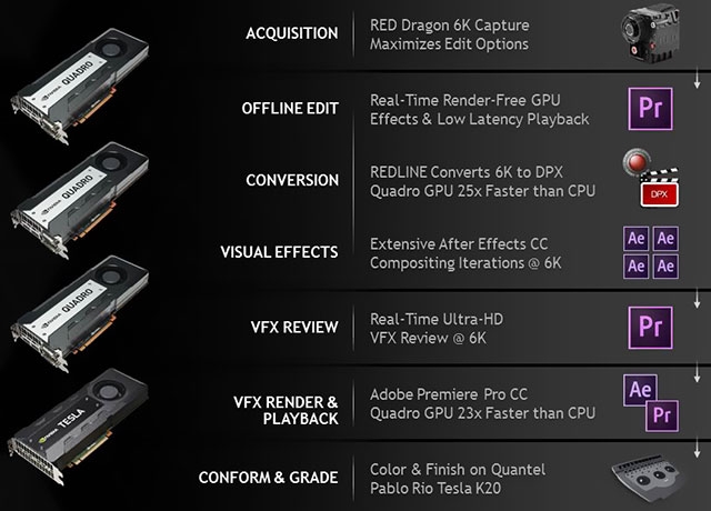 Интересным новшеством стало и то, что цифровая обработка ленты впервые для подобных проектов осуществлялась в Adobe Premiere Pro CC, благодаря чему команда получала дополнительную гибкость при постобработке отснятого материала. NVIDIA отмечает, что благодаря применению Quadro K5200 конвертирование видео между форматами происходило очень быстро (например, переход от разрешения 6К, в котором фильм снимался, к 2,5К для обработки).