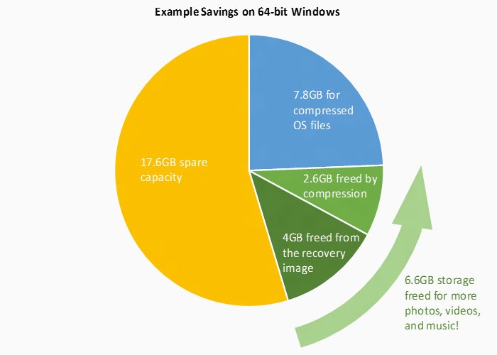 Microsoft стремится, чтобы полноценные Windows-аппараты могли быть лёгкими и мобильными, но при этом предоставляли все возможности ОС. Команды Windows, занимающиеся вопросами хранения данных и ввода в действие ПО, рассказали в официальном блоге о нововведениях, позволивших существенно уменьшить занимаемое Windows 10 пространство на накопителе. Для достижения этой цели в Windows 10 было применено два отдельных независимых подхода. Во-первых, Windows 10 использует эффективные алгоритмы сжатия системных файлов. Во-вторых, улучшения, внесённые в процесс восстановления ОС, сняли необходимость хранения специального образа на этот случай.