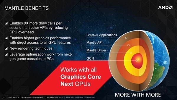 Но, кажется, ситуация начинает понемногу меняться. Глава графического маркетингового отдела AMD Роберт Халлок (Robert Hallock) считает, что с появлением на рынке Mantle и других низкоуровневых API — в первую очередь, речь идёт, конечно же, о Microsoft DirectX 12 — этому будет положен конец. Два (или более) графических процессора наконец-то смогут работать как один большой GPU и иметь доступ ко всему совокупному объёму оперативной памяти, установленному на всех графических картах в системе. В старой архитектуре набор данных, таких как текстуры и модели, в системах multi-GPU полностью дублируется.