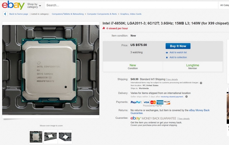 | До официального анонса новых процессоров Intel класса HEDT на основе архитектуры Broadwell-E ещё остаётся время, но новые чипы уже были замечены на всемирном аукционе eBay. Речь идёт о процессорах Intel Core i7-6950X, Core i7-6900K и Core i7-6850K. Любопытно, что название средней модели удивительно похоже на схему наименований Skylake, но путать эти архитектуры не следует, тем более что серии процессоров Skylake и Broadwell-E относятся к разным классам. Цены были указаны соответствующие уровню HEDT: Очевидно, что Intel преодолела психологическую отметку $999 и новый флагман будет продаваться по гораздо более дорогой цене, нежели компания просила ранее за старшие модели настольных процессоров. Но об этом было известно и ранее. Причём на сайте eBay для него ошибочно было указано наличие 8 ядер, а не 10. Впоследствии ошибка была исправлена продавцом. На момент написания данной заметки все три процессора были уже проданы. Как уже известно, Broadwell-E прекрасно совместимы с платформой Intel X99, требуется лишь обновление BIOS, которое уже выпустили многие производители системных плат. В крайнем случае, возможна работа процессора и без обновления микрокодов, но при старте система может его не опознать корректно. Ну и разумеется, никакой гарантии, что предложения на eBay вообще были работоспособными, поскольку речь о предварительных образцах чипов с маркировкой INTEL CONFIDENTIAL. Или кто-то нетерпеливый стал счастливым обладателем Broadwell-E, или же этого кого-то ждёт жестокое разочарование.