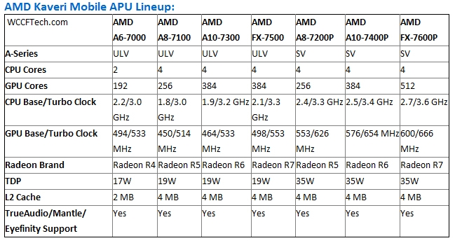 В распоряжении сетевых источников оказались данные о характеристиках ряда процессоров AMD Kaveri, предназначенных для портативных компьютеров.