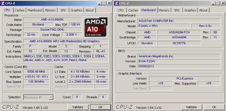 В эксперименте применялась материнская плата ASUS F2A85-V Pro, выполненная на наборе системной логики AMD A85X FCH (Hudson D4).