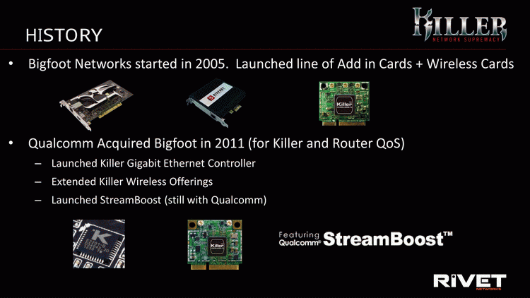 Идея аппаратного сетевого контроллера, в котором всю нагрузку по обработке сетевых пакетов берёт на себя встроенный процессор, сама по себе не нова и давно применяется в серверных адаптерах Ethernet. Но пионером продвижения такого подхода в сферу игровых решений является компания Bigfoot Networks, в своё время представившая миру полностью аппаратные решения Killer K1 и M1.