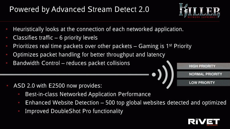 Помимо аппаратной части, полностью обновлена и программная, которая в случае с решениями Killer NIC является не менее, а то и более важной. В основе E2500 лежит технология Advanced Stream Detect 2.0, на лету распознающая типы обращающихся к сети приложений и на основе этих типов автоматически распределяющая приоритеты трафика. В новой версии ASD 2.0 умеет также распознавать до 500 веб-сайтов «белого списка», причём полностью независимо от браузера. Это может быть полезно, к примеру, для предоставления приоритета окнам YouTube. Сетевые игры получают наивысший приоритет автоматически.