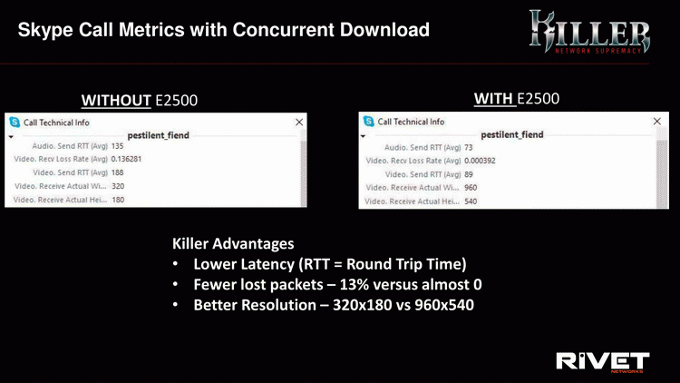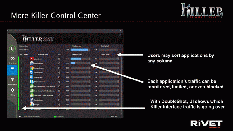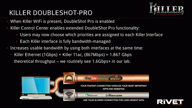 Даже в самых первых реализациях решения Killer NIC обеспечивали совместную работу сетевых игр и приложений, активно использующих трафик, включая передачу потокового видео и работу торрент-клиента. При этом аппаратная реализация сетевых протоколов не только обеспечивала низкую латентность в играх и гарантированную полосу пропускания для видео, но и совершенно не загружала центральный процессор системы, в отличие от программных реализаций QoS (Quality of Sevice). Новое поколение Killer E2500 справляется с задачами такого класса ещё лучше.