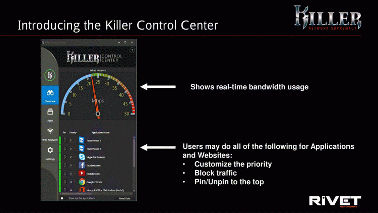 Интерфейс старой версии программного обеспечения, по мнению многочисленных обозревателей, был не слишком хорош, но разработчики в Rivet Networks прислушались к мнению пользователей и полностью переделали его. Теперь он прост и понятен. Аппаратно E2500 оперирует шестью уровнями приоритета, первый из которых является наивысшим. Игры, содержащиеся во внутреннем списке, автоматически получают приоритет 1 или 2, программы-мессенджеры довольствуются приоритетом 3, веб-трафик, в зависимости от типа, может иметь приоритеты 3, 4 или 5 (аудио и видео получают 3, простой трафик — 4 или 5), а уровень 6 используется для загрузки обновлений и скачивания больших объёмов данных.