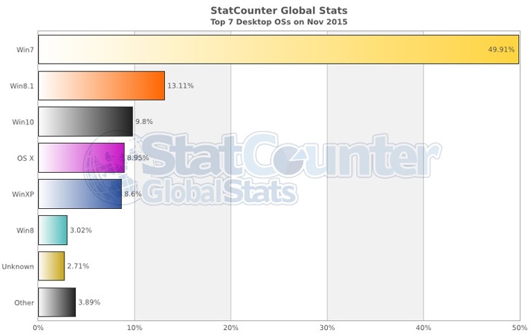 Несмотря на нарекания со стороны некоторых пользователей, Windows 10 продолжает наращивать свою долю на мировом рынке. Согласно последним данным StatCounter, она установлена уже на 9,8 % компьютеров, что ставит её на третье место среди самых популярных операционных систем для ПК. Позади остались OS X (8,95 %) и Windows XP (8,6 %), а впереди только Windows 8.1 (13,1 %) и Windows 7 (49,9 %).