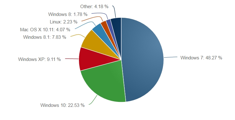 Самой распространённой программной платформой для ПК остаётся Windows 7, хотя доля этой ОС продолжает снижаться. Если год назад Windows 7 была установлена на 56,5 % персональных компьютеров с подключением к Интернету, то теперь — на 48,3 %.