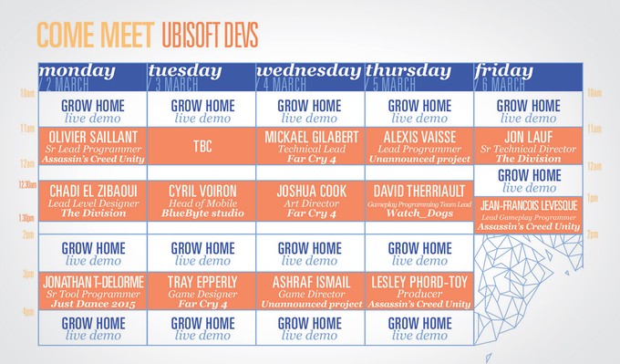 Студия Ubisoft в своем официальном блоге опубликовала запись о том, что команда планирует рассказать и показать на GDC 2015 в начале марта. Среди всего прочего, включая показ демо Grow Home и обсуждения Assassin's Creed Unity, в расписании указано, что игровой директор и ведущий программист в два разных дня будут вести речь о не анонсированном проекте.