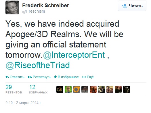 Будущее Apogee Software/3D Realms, издателя таких игр, как Shadow Warrior и Duke Nukem, в данный момент находится в руках датской компании. Согласно сообщению от датского вебсайта Borsen.dk, издатель теперь принадлежит датской компании, и новый генеральный директор, Майк Нильсон, был назначен главой компании. Нильсон является основателем инвестиционной компании SDN Invest и владельцем интернет-сайта розничной торговли CoolShop.dk. Беседуя с Borsen.dk о своей новой должности, Нильсон назвал франшизы Duke Nukem, Commander Keen, и Shadow Warrior не иначе как значимыми, которые, как он надеется, еще вернутся к былой славе. Apogee Software/3D Realms базируются в Техасе, и останутся там в обозримом будущем. Interceptor Entertainment, которая создавала игры по лицензиям Apogee Software/3D Realms и выпустила в прошлом году Rise of the Triad, базируется в городе Хернинг, Дания. Apogee Software/3D Realms и Interceptor Entertainment в настоящее время участвуют в судебном процессе с Gearbox Entertainment за право использовать лицензию Duke Nukem, которую приобрела Gearbox для того, чтобы завершить разработку Duke Nukem Forever. Генеральный директор Interceptor Entertainment, Фредерик Шрайбер, подтвердил о данном приобретении посредством Твиттера.