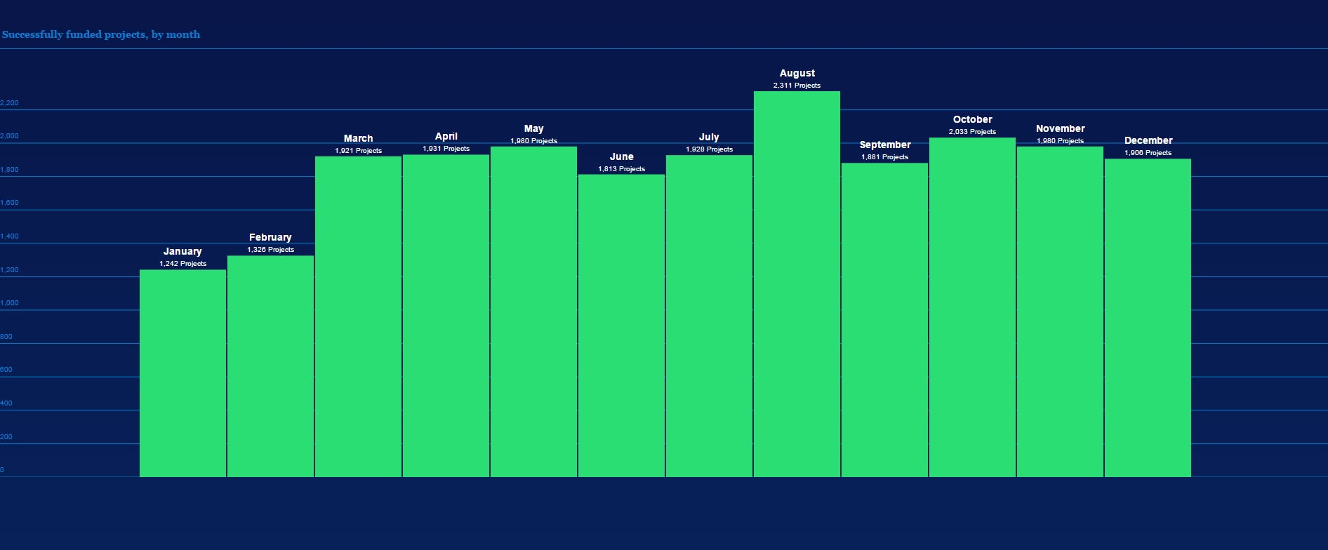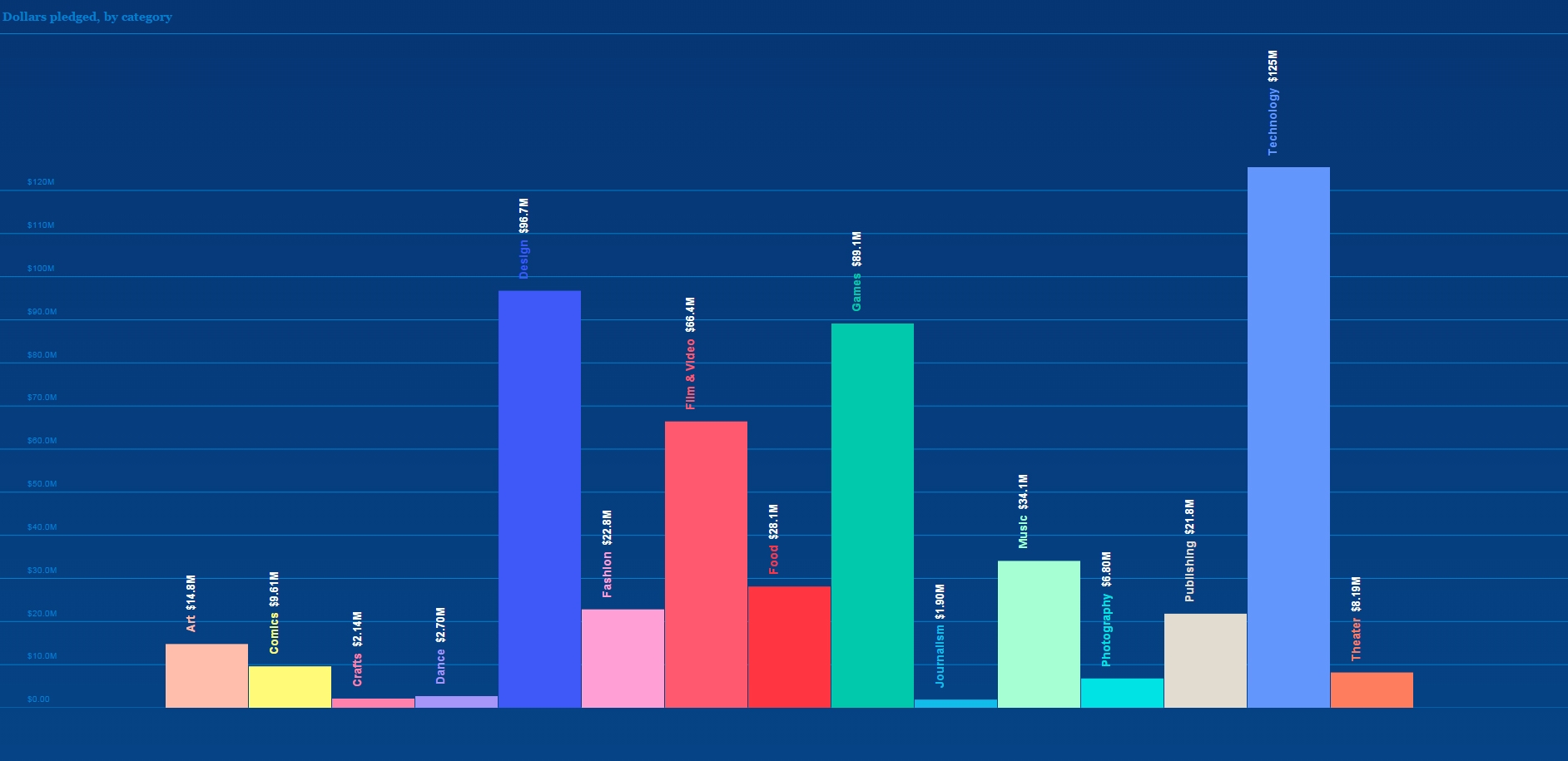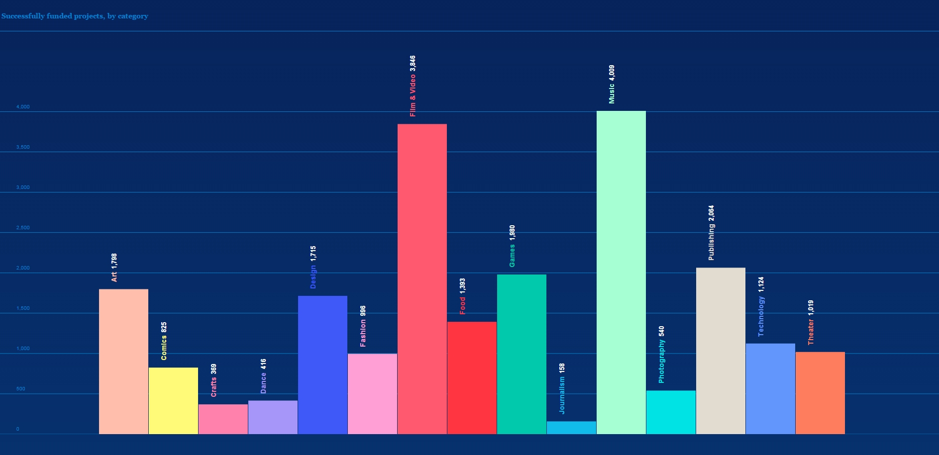 Наибольшее количество успешно профинансированных проектов пришлось на категорию «Музыка» (4 009). Вторую строчку занимают «Фильмы и видео» (3 845), а на третьей разместились «Издательские проекты» (2 064), немного опередившие «Игры». Пятое место отошло «Искусству» (1 796), которому незначительно уступил «Дизайн» (1 715). На седьмую позицию забралась «Еда» (1 393), восьмой стала категория «Технологии» (1 124), а девятой — «Театр» (1 019). Не смогла преодолеть порог в тысячу проектов «Мода» — в этом секторе профинансировали только 996 кампаний. Наименьшими успехами выделились «Журналистика» (158) и «Ремесло» (369), но этому есть объяснение — данные категории были добавлены в июне 2014 года.