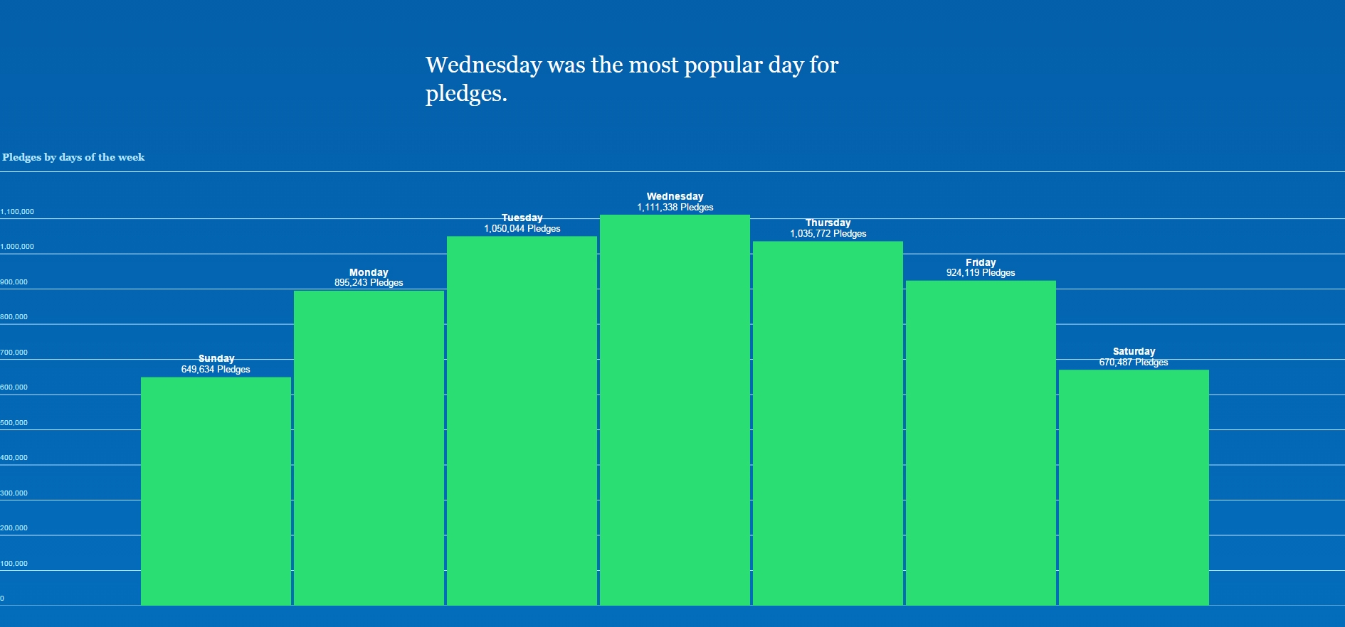 В среднем больше всего средств перечислялось в среду, а в субботу и воскресенье активность вкладчиков сильно снижалась. Одним из самых благоприятных дней для Kickstarter стало 12 марта, когда всего за час (с 11:00 до 12:00) пользователи пожертвовали почти $400 тыс. — примерно $110 в секунду. Именно в этот день Нил Янг (Neil Young) запустил кампанию по сбору средств на портативный цифровой музыкальный проигрыватель Pono.