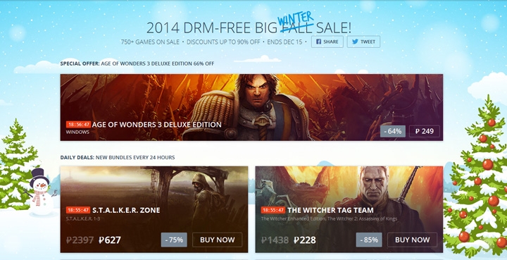 Кроме того, вы можете приобрести разнообразные проекты, полностью лишённые каких бы то ни было средств защиты от копирования (распространение избавленных от DRM продуктов является ключевой особенностью GOG). Также каждая покупка сопровождается различными цифровыми бонусами вроде руководства пользователя, обоев для рабочего стола, аватарок, артбуков и тому подобного. Наконец, в течение двух суток будет действовать молниеносная распродажа Frost Flash Frenzy, когда каждый час друг друга будут сменять значительные скидки на 30 наименований.