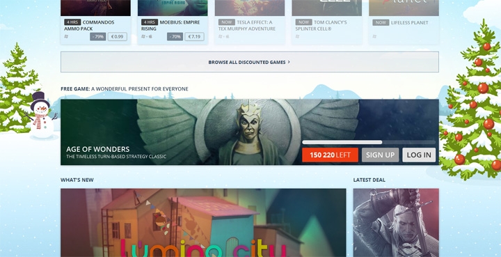 Дистрибьюторы решили не ограничиваться простыми скидками: особо расторопным пользователям они раздают подарки — бесплатные цифровые копии пошаговой стратегии Age of Wonders, классического проекта Triumph Studios и Epic MegaGames, заложившего основу целой серии. Только вам нужно поторопиться — всего будет отдано 250 тысяч копий, из которых на момент написания новости 100 тысяч уже разошлись.