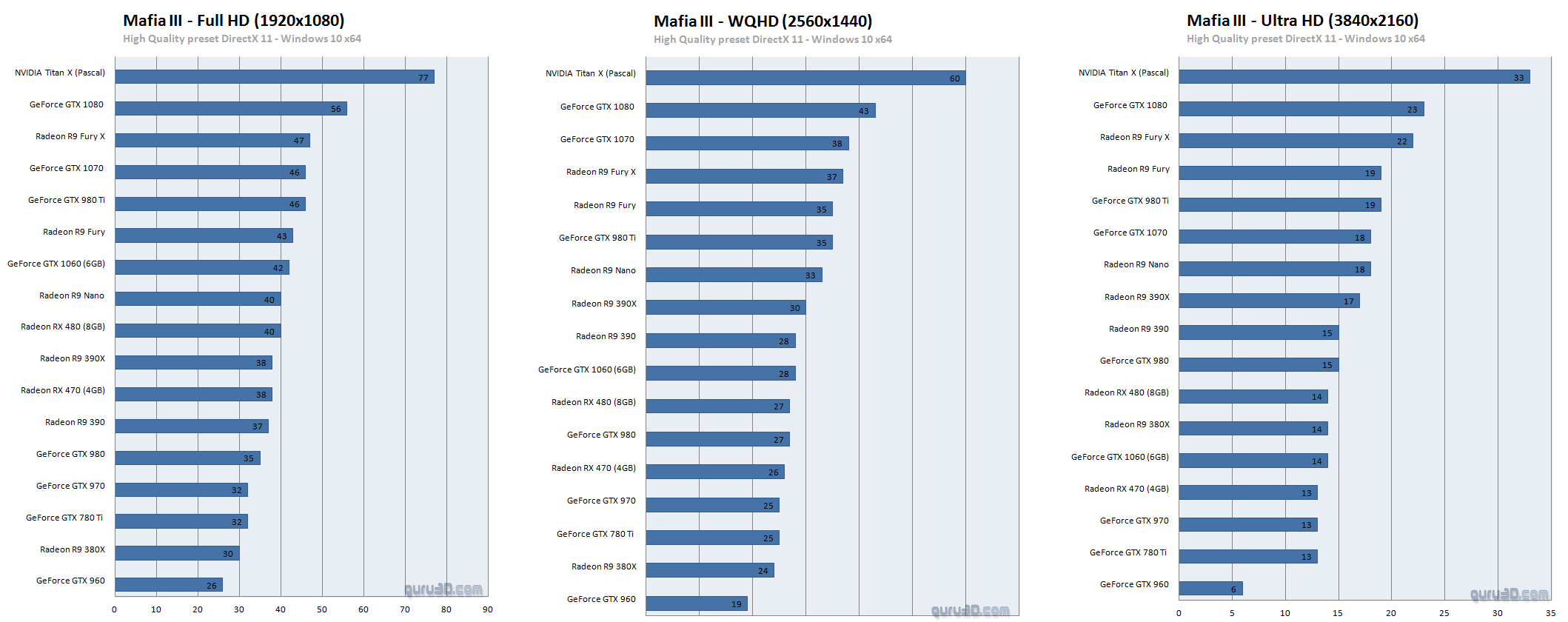 Повышение разрешения до 2560 × 1440 уменьшает кадровую частоту на TITAN X с 77 до 60 к/с, а для 30 кадров в секунду требуется Radeon R9 390X или серьёзно разогнанная карта GeForce GTX 980. Наконец, на 4K-мониторе играть в Mafia III при высоком качестве графики можно рекомендовать только владельцам NVIDIA TITAN X.