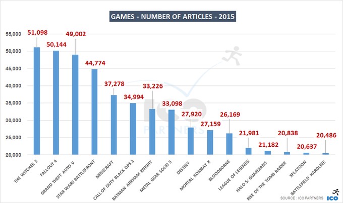 Хотя нельзя не отметить, что Fallout 4 подобрался весьма близко и возможно даже занял бы первое место, если бы The Witcher 3 вдруг оказался менее успешен. Всего о польской RPG было написано свыше 51 тысячи материалов, на тысячу больше чем о Fallout 4 и на две тысячи больше, чем о GTA V.