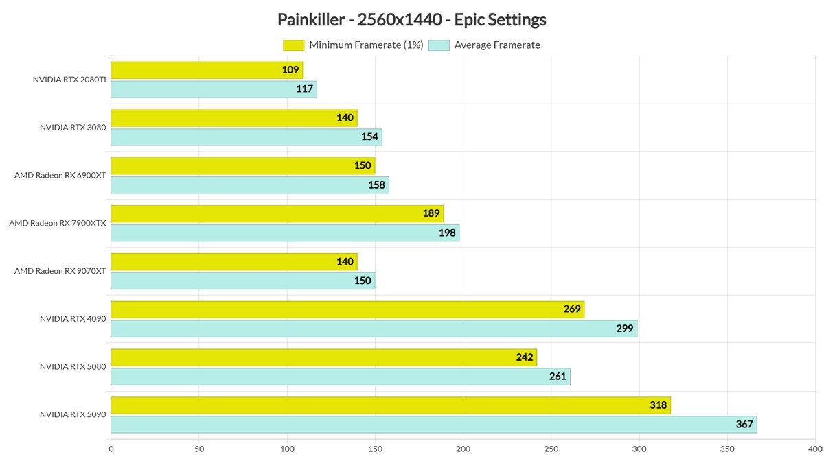 Журналисты из DSOGaming продолжают тестировать видеоигровые новинки. На этот раз их длинные руки с небольшим опозданием дотянулись до кооперативного шутера Painkiller. Для тестов использовались процессор AMD Ryzen 9 7950X3D, 32 ГБ DDR5 с частотой 6000 МГц, а также видеокарты RX 6900XT, RX 7900XTX, RX 9070XT, RTX 2080Ti, RTX 3080, RTX 4090, RTX 5080 и RTX 5090.