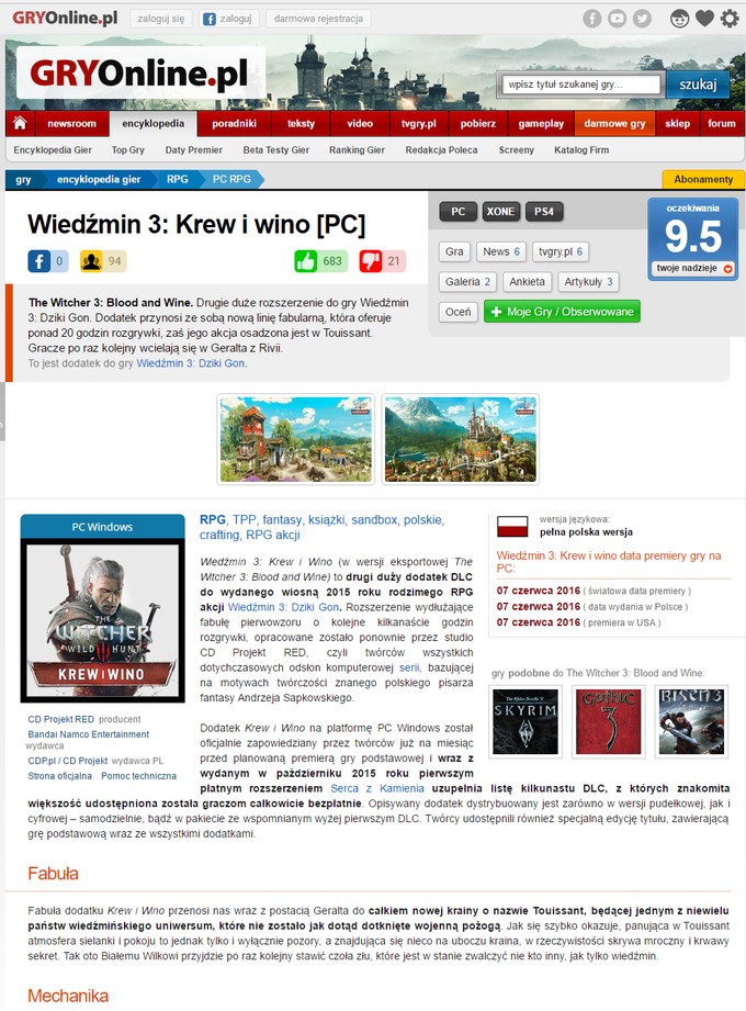 Польский игровой сайт GRYOnline опубликовал у себя дату релиза DLC The Witcher 3: Кровь и Вино.