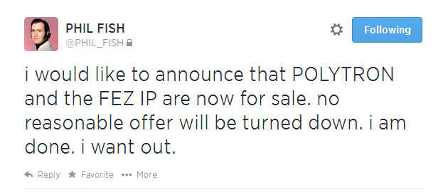Фил Фиш (Phil Fish), основатель независимой монреальской студии Polytron Corporation, ответственной за Fez, объявил о том, что собирается покинуть игровую индустрию и продать свою компанию вместе с правами на небезызвестный платформер. Об этом он написал в своём твиттере, однако позже удалил соответствующую запись и аккаунт.