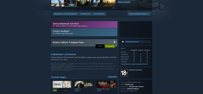 Пока игроки Fallout 4 исследуют новое дополнение Automatron или же просто ждут хардкорного режима (в режиме беты уже на следующей неделе) в Steam было обнаружено падение цены на Сезонный Пропуск — теперь сборник дополнений стоит 1799 рублей, в то время как Fallout 4 отдают со скидкой в 33% по цене в 1339 рублей.
