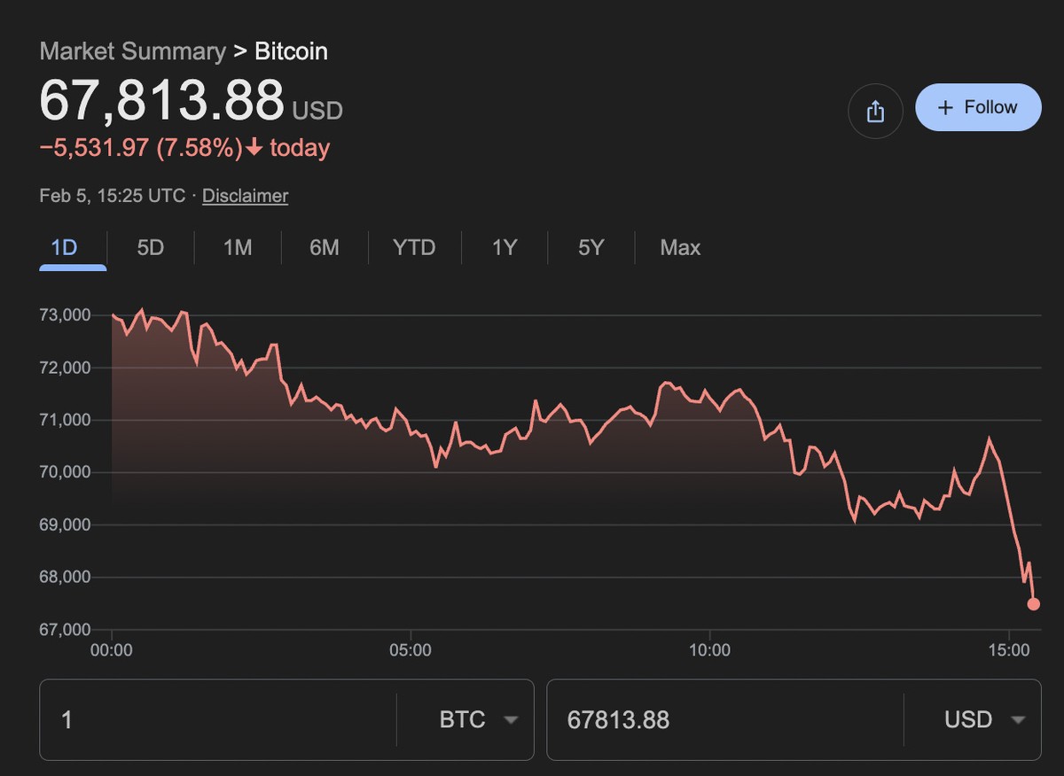 Bitcoin переживает худший старт года с момента своего создания. Криптовалюта обвалилась почти на 14% с начала 2026 года и на 40% с октябрьских максимумов выше $120 000 – самая длительная серия потерь с 2018 года. На момент написания цена составляла около $67 813.